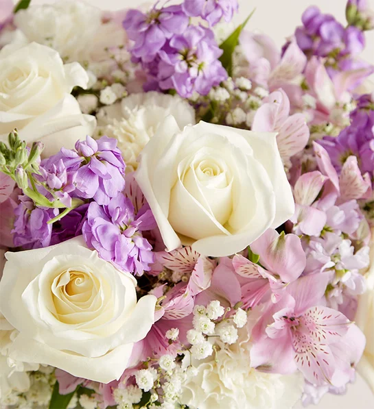 • All-around arrangement with white roses and carnations; lavender Peruvian lilies (alstroemeria) and stock; accented with baby’s breath and assorted greenery
