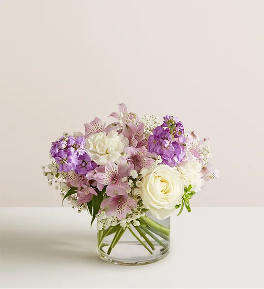 Lovely memories are made with thoughtful gifts for the ones we care about. Our charming lavender flower bouquet is loosely gathered with a medley of lavender & white blooms. Hand-designed inside a clear cylinder vase with cascading greenery all around, it’s a wonderful way to express the sentiments you have inside your heart.